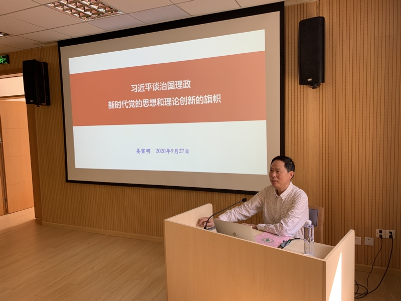 姜富明书记首先作了题为《习近平谈治国理政——新时代党的思想和理论创新的旗帜》主题报告。报告从党的十九大报告、新时代中国特色社会主义、五位一体总布局和内外环境保障等方面介绍了第三卷的特色内容,并分析了第三卷与第一卷、第二卷的区别,要求要坚定自信、一以贯之、高举旗帜、倍加珍惜。今年疫情在全球爆发,我国对疫情的控制就体现出了社会主义制度的优越性。他指出,第三卷包含了坚定的理想信念、鲜明的价值取向、强烈的问题导向、深邃的世界眼光、系统的科学思想,深刻回答了新时代坚持和发展中国特色社会主义的一系列重大理论和实践问题,是新时代党的思想和理论创新的旗帜。