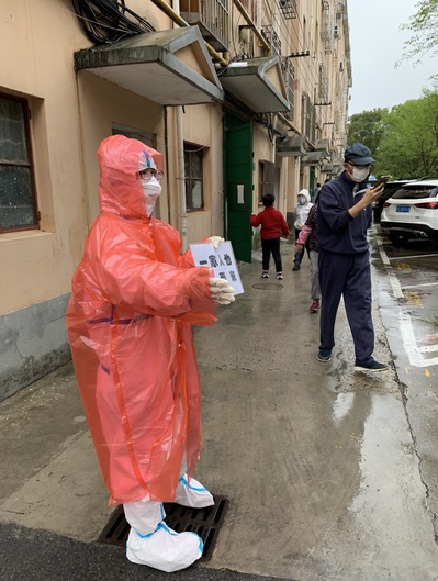 机关第一党支部党员王滟,自小区封闭管理3月14日起,第一时间向社区居委亮明身份,扛起责任,主动请缨,积极参与徐汇区漕河泾街道科苑居委的各项志愿服务中。因所在小区户多、人多、阳性病例与日俱增,居委干部和社区志愿者的工作显得更为辛苦和危险,但是只要居委一声号召,王滟必定第一时间响应,化身“大白”投身到抗疫防疫的第一线。作为经历过2020年疫情的“老”志愿者,这次又积极参与到分发政府物资,协助居民信息核对,挨家挨户分发抗原试剂,核酸检测扫码登记,核酸现场维持秩序等志愿者工作中。虽然每一次工作很累很辛苦,有时一干就是八、九个小时,整个过程不能喝一口水吃一粒饭,但王滟觉得能为社区抗疫尽绵薄之力,这些都是一名共产党员应该做的。
