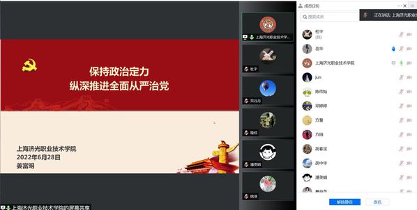 6月28日上午,学校以线上、线下相结合的方式召开党委理论学习中心组(扩大)学习会,党委书记姜富明作《保持政治定力 纵深推进全面从严治党》专题报告并部署下阶段学校党委从严治党工作,党委副书记、纪委书记刘丽领学上海市第十二次党代会精神,传达2022年市教卫工作党委系统全面从严治党工作会议精神。会议由姜富明书记主持,全体党委、纪委委员,各院系部党政负责人、机关职能部门负责人参加本次学习会。