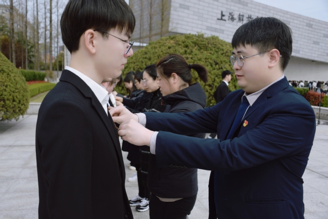 传承红色基因,赓续英烈精神。师生们通过祭扫活动汲取精神养分,凝聚奋进力量,激发前进动力。在祭扫仪式后,教师党员为新发展的学生党员佩戴党徽。佩戴过程中教师党员与预备党员亲切交流,嘱咐新党员要自觉履行党员义务,听党话、感党恩、跟党走,全心全意为人民服务,新党员党徽佩戴仪式体现了党的伟大事业代代相传,同时也传递党员的责任和担当精神。其后,全体党员师生面对鲜红的党旗和庄严的烈士纪念碑,在学生支部书记王佳璟老师的领誓下,许下铮铮誓言,表达出不忘初心,践行使命的决心和毅力。
