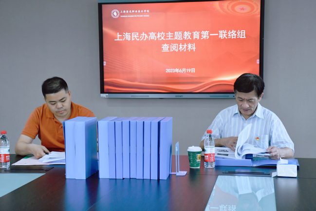 ▲上海民办高校主题教育第一联络组朱坚强组长、联络员陈少东查阅台账资料