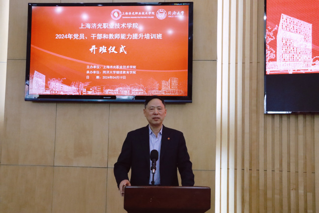 4月19日下午,2024年党员、干部和教师能力提升培训班开班仪式在宝山校区圆形会议室举行。本期培训班共有110名学员,同济大学党委常委、副校长石振明、上海市委党校科社教研部副主任上官酒瑞、我校校领导、校党委理论学习中心组成员、各基层党组织书记及全体培训班学员出席开班仪式。会议由同济大学继续教育学院副院长考书健主持。