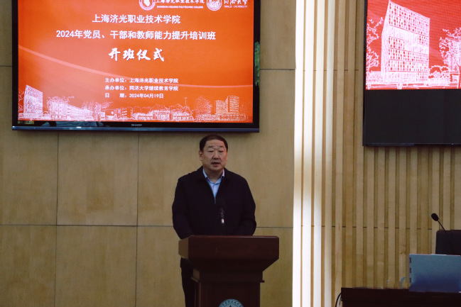 开班仪式上,同济大学石振明副校长致辞。他强调了济光学院与同济大学具有天然的纽带联系与合作共建基础,此次学习培训也是双方探索公办与民办高校党建共建机制的重要体现。希望通过本次“党员、干部和教师能力提升培训班”的学习,继续加固两校的友谊之桥,不断创新共建载体,取得双向互动、互惠双赢的共建效果。