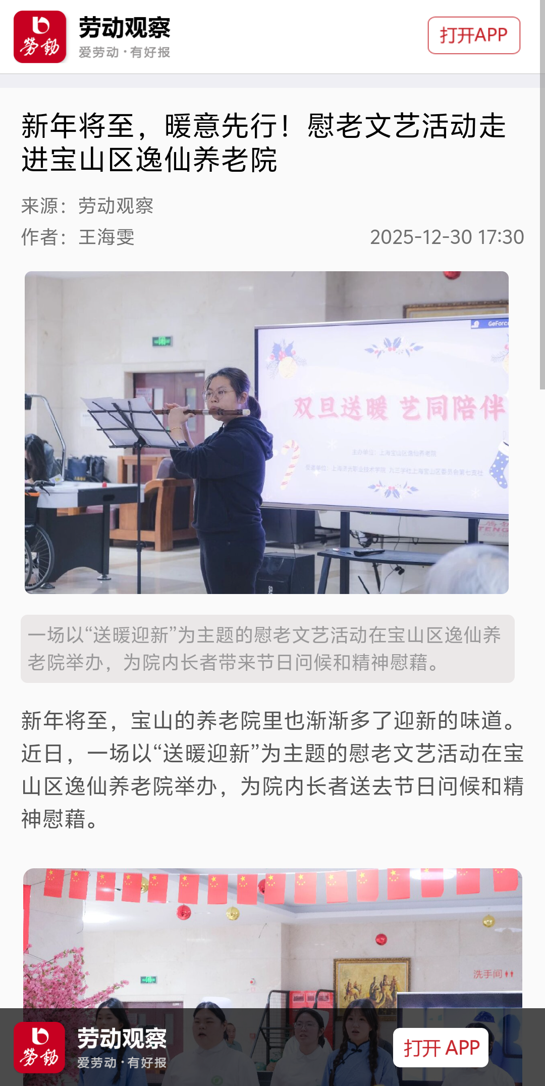 2025年12月30日,由宝山区逸仙养老院、九三学社宝山区委第七支社、上海济光职业技术学院联合主办的“送暖迎新”慰老文艺活动在逸仙养老院成功举办。活动以文艺表演与专题座谈相结合的形式,为老年群体送去节日关怀,探索养老服务新模式,展现社会各界对老龄化社会问题的关注与责任担当。12月30日,“劳动观察”客户端对本次活动进行了专题报道。